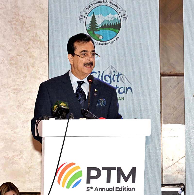 Chairman Senate, Syed Yousuf Raza Gillani, addresses the gathering as chief guest at the National Tourism Dialogue, organized under the Pakistan Travel Mart (PTM) 2026.