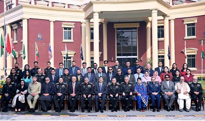 Chairman Senate Syed Yusuf Raza Gilani Chief of the Naval Staff (CNS) Admiral Naveed Ashraf NI(M) T Bt in a group photograph with participants after the closing ceremony of the 8th Maritime Security Workshop (MARSEW-8) at Pakistan Navy War College.