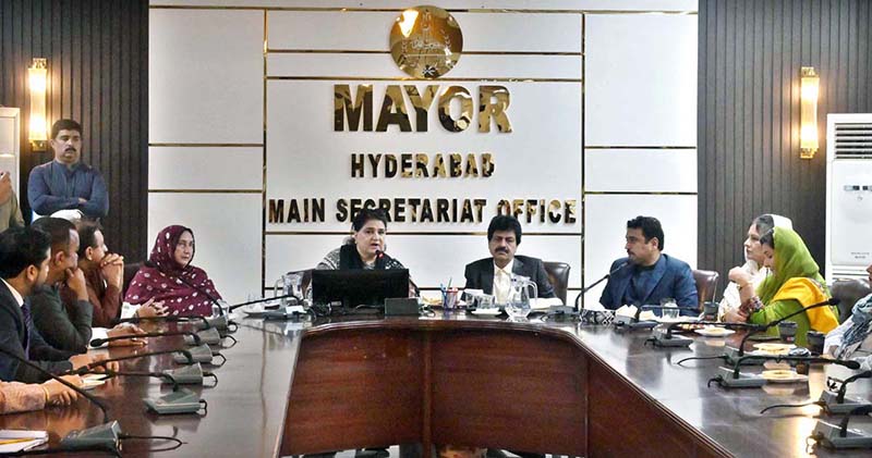 HYDERABAD: February 25 – Chairperson Benazir Income Support Program (BISP), Senator Rubina Khalid addressing to elected representatives of local government at Mayer Main Secretariat office.
