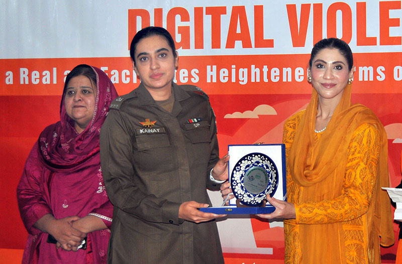 Chairperson Punjab Women Protection Authority, Hina Pervez Butt distributes shields among participants during a ceremony held in connection with the 16 Days of Activism campaign against violence toward women.