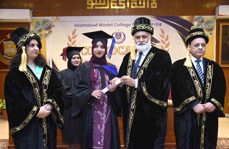 APP03-021225 ISLAMABAD: December 02 – APP04-021225 ISLAMABAD: December 02 – Chief Guest Vice Chancellor QAU Prof. Niaz Ahmad, Principal Dr. Saadia Aziz awarding degree to a successful student during the 1st Convocation of Islamabad Model College for Girls F-7/4. APP/TDZ