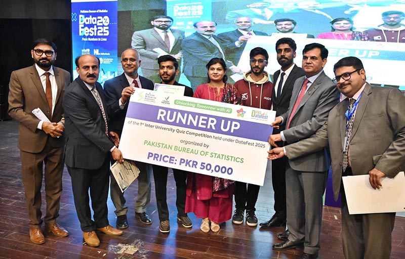 ISLAMABAD: November 12 – Chief Statistician, Pakistan Bureau of Statistics (PBS), Dr. Naeem Uz Zafar, and SS/RM PBS, Muhammad Sarwar Gondal, distribute awards and cheques among participants of Quiz, Poster, and Project competitions during the closing ceremony of DataFest-2025 at the Pak-China Friendship Centre. APP/SMR/IJQ/TZD/SSH