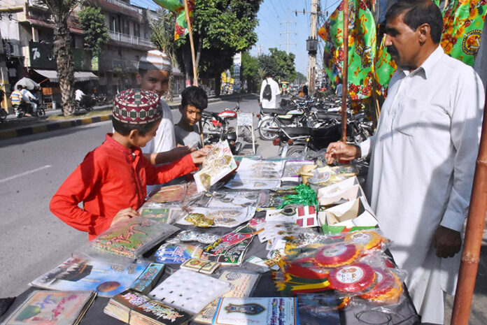 Children are buying decorative items from roadside stalls to decorate their homes on Milad-ul-Nabi (PBUH),as Muslims celebrate Eid Milad un Nabi,on the birthday of the Islamic prophet Hazrat Muhammad (PBUH) on the 12th day of Rabi’ al-awwal.