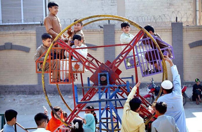 Children enjoying a portable swing at the roadside in the Tehsil area.