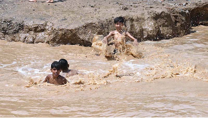Children enjoying bath in the rain water accumulated in water pond in the Federal Capital