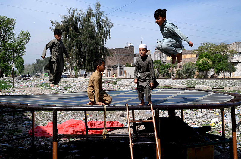 Children enjoying jump on trampoline during Eid holidays at Ring Road area. APP12-240326PESHAWAR: March 24 – Previous Post A vendor displaying melons to attract the customers along the roadside. Next Post A large number of children enjoy tri-wheeler ride at Tehsil area during Eid holidays.