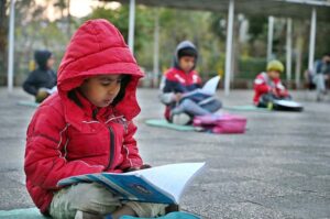 Children from slum area getting education by a volunteer teacher at an open area in F-6 while the world observes International Day of Education