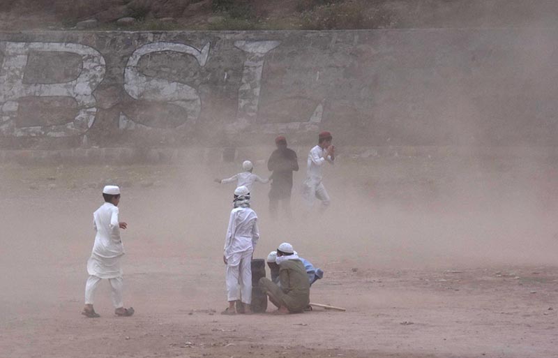 ISLAMABAD: May 24 – A strong dust storm obstruct commuters on Srinagar Highway at Barakahu area.