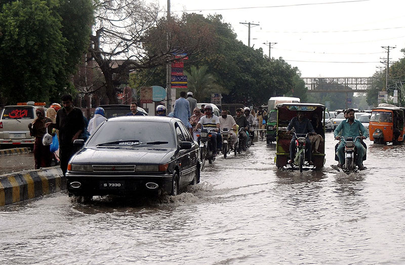 MULTAN JULY 19: City streets transform into rivers as heavy rains inundate roads, challenging drivers to navigate through the storm in the city.