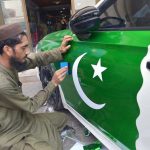 Clock Chowk Courthouse illuminated with green and white lights, a beautiful display by the district administration ahead of Independence Day celebrations. APP41-120825SIALKOT: August 12 – Previous Post A traffic police officer browsing national flag badges at a festive items stall to purchase for Independence Day celebrations on Jinnah Road. Next Post A man carefully pasting a national flag sticker on a vehicle as part of preparations for Independence Day celebrations at FC Chowk.
