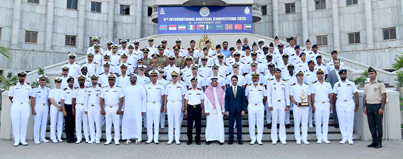 KARACHI: November 13 – Commander Karachi, Vice Admiral Muhammad Faisal Abbasi in a group photo with participants of 5th Pakistan Navy International Nautical Competition 2025 held at PNS RAHBAR. APP/ABB