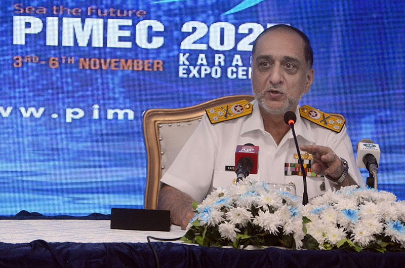 KARACHI: November 01 - Commander Karachi Vice Admiral Muhammad Faisal Abbasi briefing the media persons about the Pakistan International Maritime Expo and Conference 2025, commencing from November 3 to 6, at Expo Centre. APP/SDQ/FHA