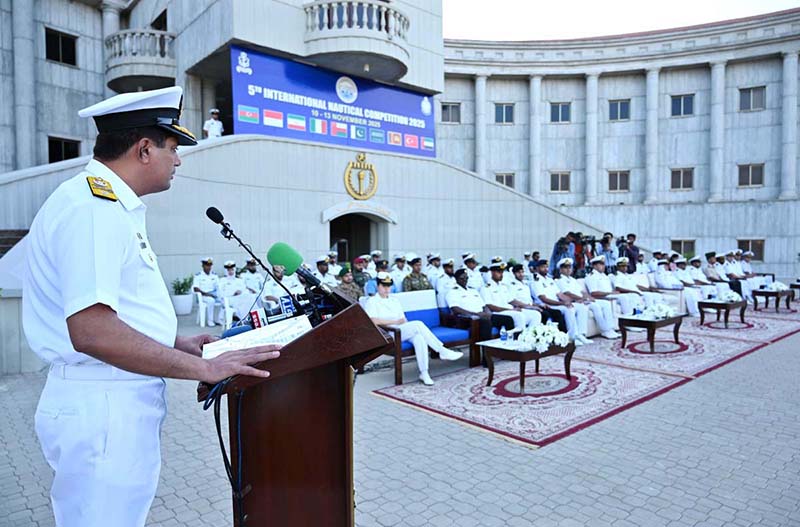 KARACHI: November 10 – Commodore Commandant Zia Ur Rehman T (M) speaks at the inauguration of the 5th International Nautical Competition 2025 at Pakistan Naval Academy. APP/SDQ/TZD/SSH