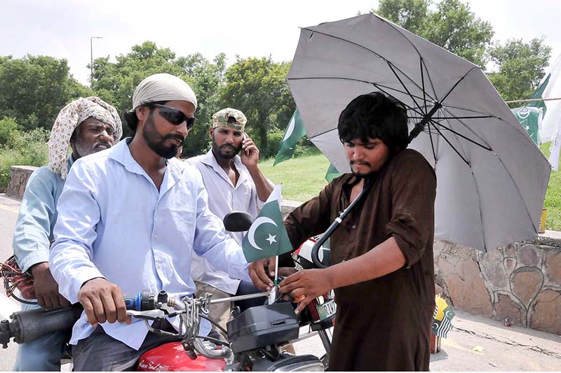 ISLAMABAD: August 12 – Commuters take break to purchase national flag as the nation celebrates the Independence Day with evangelism across the country. APP/SAK/ABB