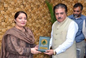 QUETTA: October 07 – Secretary Forest Department Dostain Jamaldeni presenting Balochistan Shawl to the Coordinator to Prime Minister on Climate Change, Romina Khurshid Alam on her visit. A