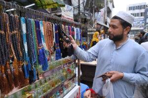 Customer selecting beads for prayer from roadside vendor at Sadar Bazar