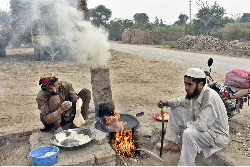 Daily wage laborers cook bread on a wooden stove near Ravi Road. APP59-260225LAHORE: February 26 – Previous Post Brig Retd Muhammad Sajid Khokhar Chairperson TEVTA cutting the ribbon to inaugurate Kisan Mela at Govt Pak German Polytechnic Institute for Agriculture Technology, Chak 5 Faiz. Next Post A pillion rider woman carrying a bicycle in a risky way traveling on PIA Road.