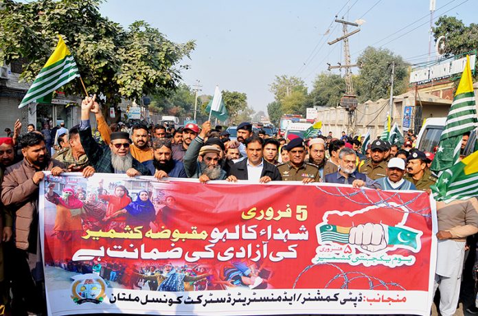MULTAN: February 05 - DC Noman Siddiqui and CPO Sadiq Ali Dogar participate in a rally to mark Kashmir Solidarity Day, expressing support with the people of Indian-occupied Kashmir, organized by City District Government. APP/TVE/ABB