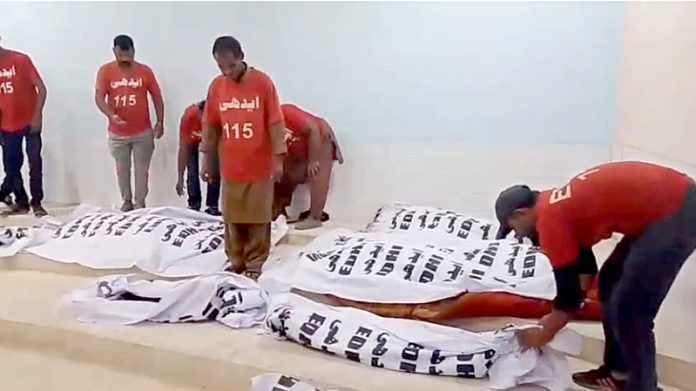 KARACHI: February 13 – Dead bodies of the victims of an accident on a highway involving a passenger bus and a truck. At least 12 people, including women and children, are dead and several others injured in a multi-vehicle collision involving an oil tanker, a passenger bus, and other cars near Kathore. APP/ABB