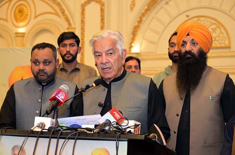 SIALKOT: March 09 – Defence Minister Khawaja Muhammad Asif and Minister Minorities Punjab Sardar Ramesh Singh Arora distributing Chief Minister Punjab Minority Cards at a local hotel. APP/MUT/FHA