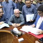 SIALKOT: April 19 – Defense Minister Khawaja Asif & Ahsan Iqbal Chaudhry, Federal Minister for Planning, Development and Special Initiatives are addressing to Interactive session of export oriented trade bodies organized by Organized by Pakistan Readymade Garments Association. APP/MUT/ABB