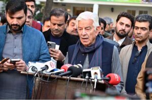 SIALKOT: January 12 – Defense Minister Khawaja Muhammad Asif is addressing the ceremony to celebrate the victory of Sialkot Cricket Team in the Quaid-e-Azam Trophy 2024-25. APP/MUT/TZD/FHA