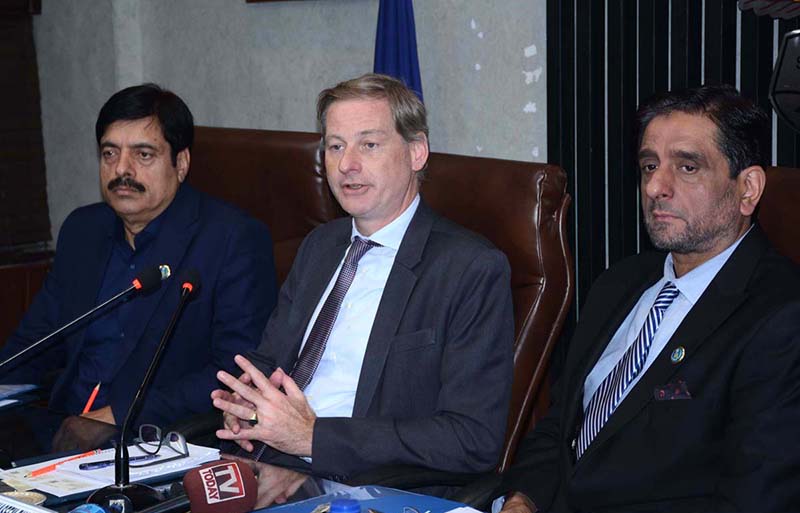 FAISALABAD: February 19 – President FCCI, Rehan Naseem Bharara is presenting FCCI Shield to Hajo Provo Kluit, Deputy Ambassador Embassy of the Kingdom of Netherlands during his visit to Faisalabad Chamber of Commerce & Industry (FCCI). APP/TWR/IQJ/TZD/ABB