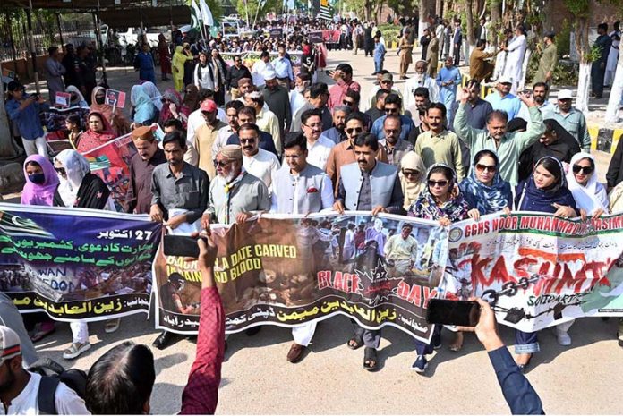 HYDERABAD: October 27 β Female students participate in a rally to show solidarity with the people of Indian Illegally Occupied Jammu and Kashmir on Kashmir Black Day along Thandi Sarak. APP/FHN/MAF/TZD/SSH