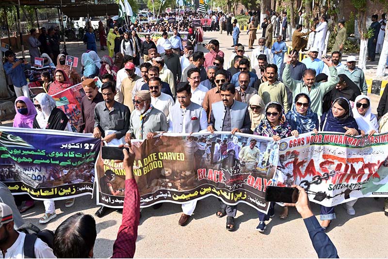 HYDERABAD: October 27 β Female students participate in a rally to show solidarity with the people of Indian Illegally Occupied Jammu and Kashmir on Kashmir Black Day along Thandi Sarak. APP/FHN/MAF/TZD/SSH