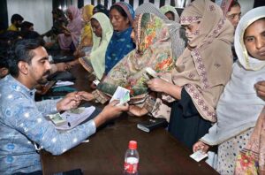 SARGODHA: October 14 – A retailer distributing cash to deserving women at Benazir Income Support Program, Quarterly Payment Distribution Center established at Company Bagh.