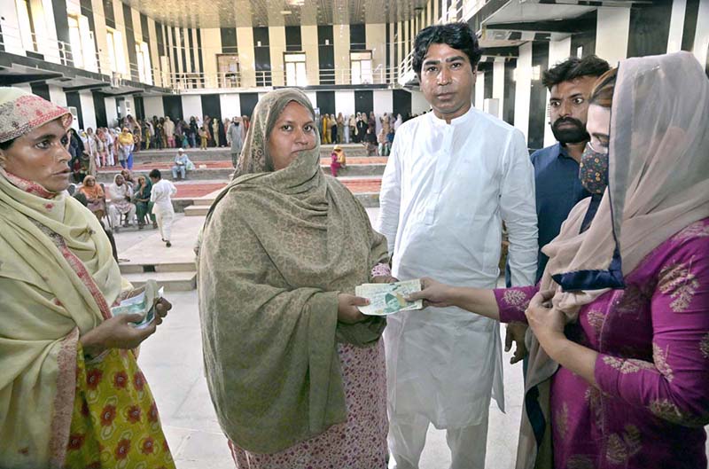 SARGODHA: October 14 – A retailer distributing cash to deserving women at Benazir Income Support Program, Quarterly Payment Distribution Center established at Company Bagh.
