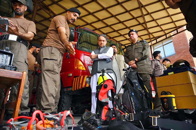 PESHAWAR: May 15 – Rescue 1122 officials giving briefing to Secretary Relief Yousaf Raheem regarding latest rescue equipment used in different emergencies at Rescue 1122 Headquarters.
