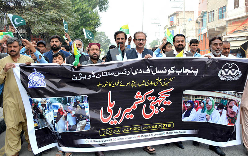 MULTAN: October 27 – Students view photographs highlighting the suffering and resilience of the Kashmiri people during an exhibition organized to mark Kashmir Black Day. APP/SFD/MAF/TZD/SSH