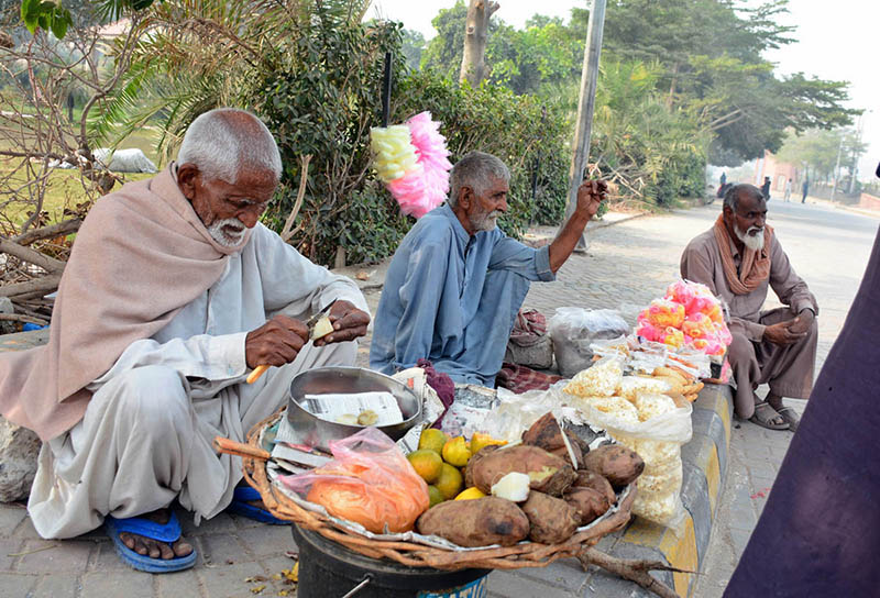 Elderly vendors selling sweet potatoes and cotton candy at roadside in Qasim Bagh, striving to earn their livelihood through honest labor.