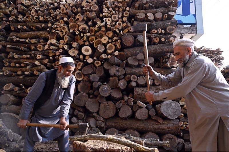 ISLAMABAD: December 12 - Elderly workers cut wood into pieces at their workplace in the Federal Capital, preparing it for sale. APP/SAK/MAF/FHA