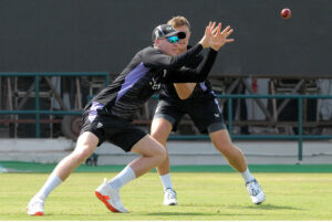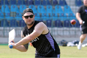 England’s Head Coach Brendon McCullum gives catch practice during a training session before the first Test match against Pakistan at Multan Cricket Stadium