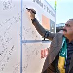 ISLAMABAD: October 27 – Engr. Amir Muqam, Federal Minister for Kashmir Affairs, Gilgit-Baltistan and SAFRON, Patron-in-Chief Pakistan Sweet Homes Zamurd Khan along with APHC leadership on stage during solidarity walk regarding Kashmir Black Day from Foreign Office to D-Chowk. APP/SAK/MAF/TZD