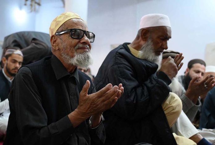 PESHAWAR: February 20 - Faithfuls offering dua during first Jumma-tul-Mubarak prayer at historic Sunehri masjid during the Holy fasting month of Ramzanul Mubarak. APP/SYR/MAF/FHA