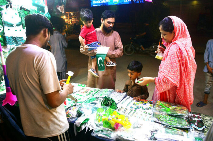 Family selecting and purchasing National flag and other items in connection with upcoming Independence Day celebrations from roadside stall at Latifabad.