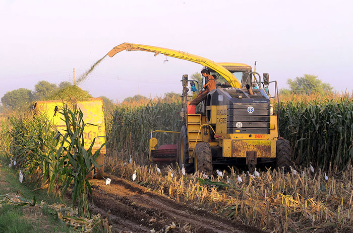 MULTAN: October 13 – Farmers harvesting corn plants through a harvester machine in their fields to be used as fodder for their animals.