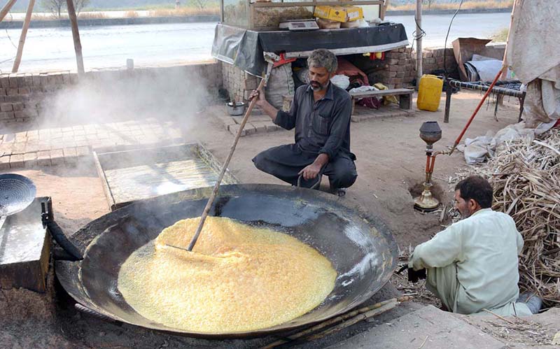 Farmers preparing traditional sweet item ‘Gur’ at Sheikhupura Road.
