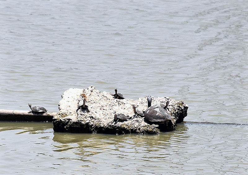 HomePhotosPhoto FeatureA view of tortoises sitting on dry patch in water pond near...