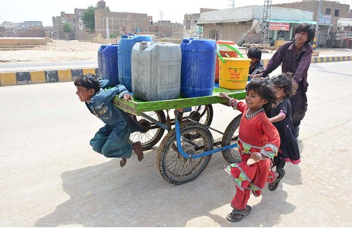 Gypsy children pushing hand cart loaded with water canes after filling from tap at Qasimabad