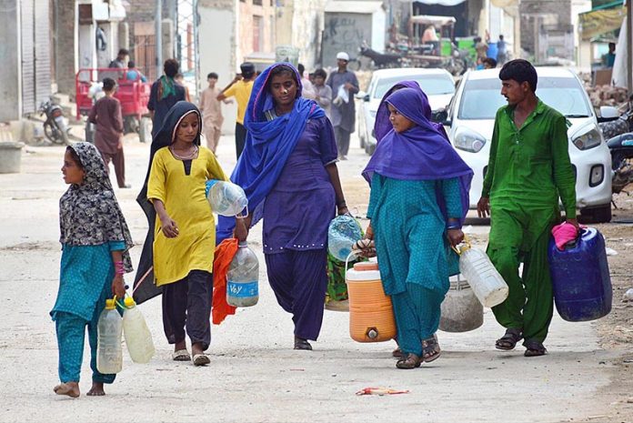 Gypsy women on the way while carrying pots for filling clean drinking water at Qasimabad
