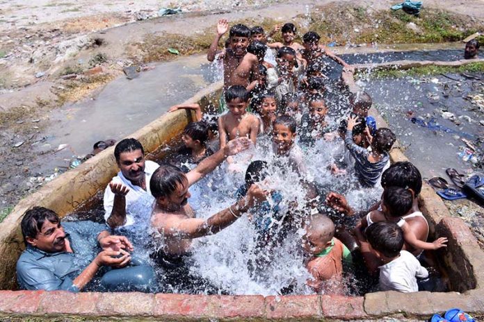 People along with children enjoying bathing in the watercourse to get some relief from hot weather in Ghulam Bhutto Village