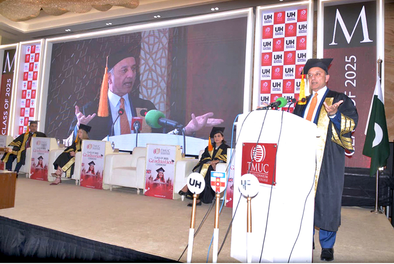 Federal Minister for Climate Change and Environmental Coordination, Senator Dr. Musadik Masood Malik, delivers the keynote speech as Chief Guest at the Graduation Ceremony of the Millennium Universal College (TMUC)