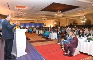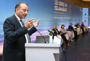 Federal Minister for Climate Change & Environmental Coordination Senator Dr. Musadik Malik addressing ‘Leaders in Islamabad’ Business Summit-2025 on Crafting Sustainable Climate Future at a local hotel.