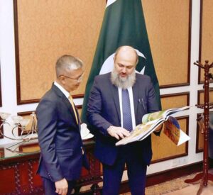 APP13-031024 ISLAMABAD: October 03 – APP12-031024 ISLAMABAD: October 03 – Federal Minister for Commerce Jam Kamal Khan presents “Exploring Pakistan” tourism guide to Malaysian Minister Tengku Zafrul.