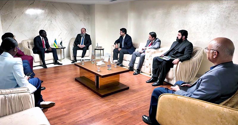 Federal Minister for Commerce Jam Kamal Khan holds a sideline meeting with Rwanda's Minister of Trade and Industry Prudence Sebahizi on the margins of the Rwanda Coffee Festival in Islamabad to discuss expanding bilateral trade, establishing direct supply chains and enhancing business-to-business cooperation, as Coordinator to the Prime Minister for Commerce Rana Ihsaan Afzal Khan is also present.
