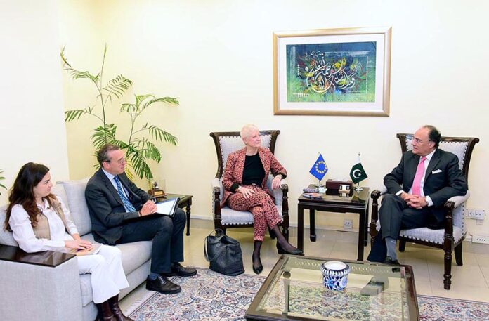 Federal Minister for Finance and Revenue, Senator Muhammad Aurangzeb, holding a meeting with Dr. Riina Kionka, Ambassador of the European Union to Pakistan, at the Finance Division.
